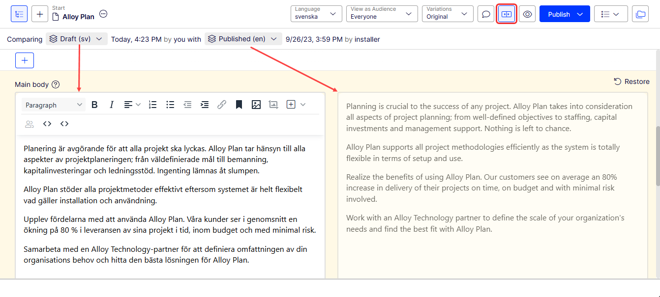Translate existing content in Optimizely CMS 13. Switch languages, view language versions, and translate pages and blocks for a multi-language website.