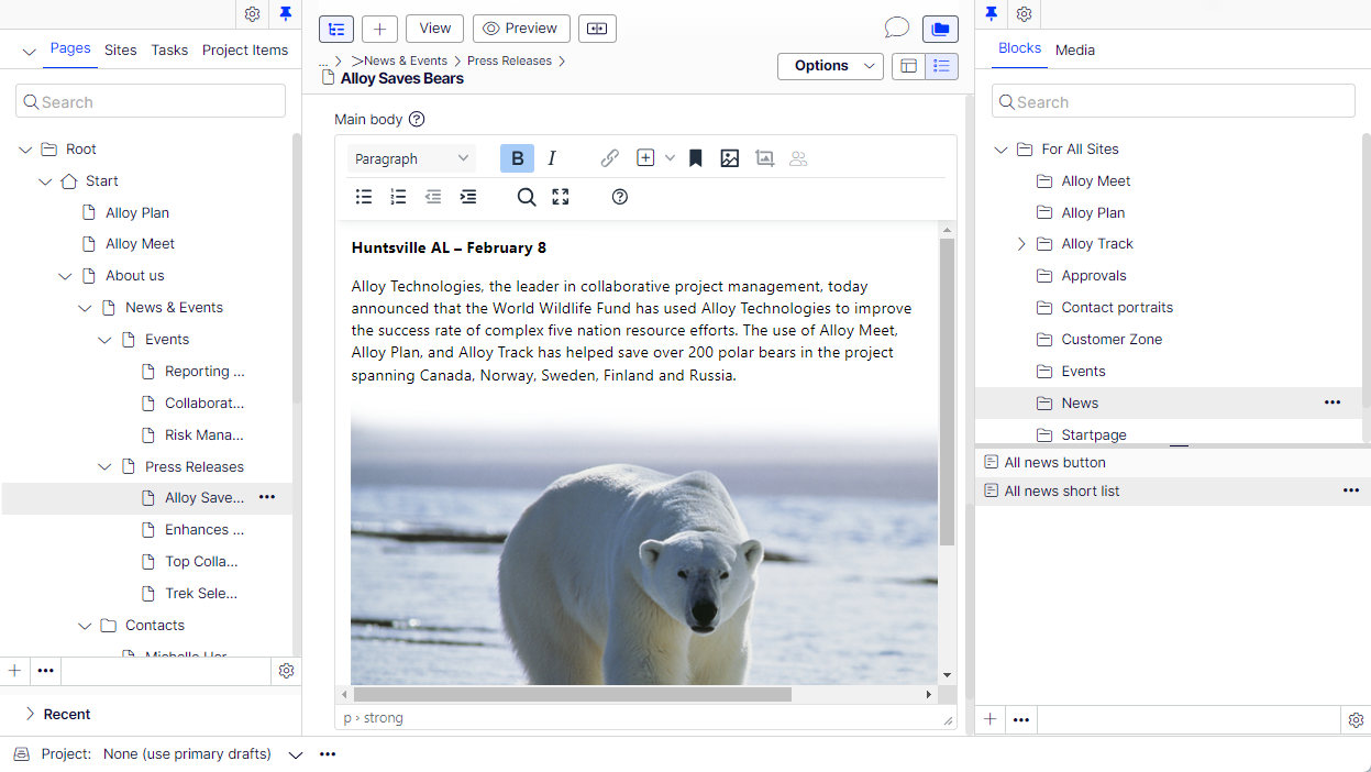 NoteThe functionality "Fetch content from another content item" only applies when a property is considered "Null". For a block property, this means that properties within the block must be null for fetch content to apply. This can be an issue if the block contains a primitive type, such as a bool, nullable bool, int or nullable int, and that has a value. It is currently not possible to set a null value for those properties from the edit UI, meaning that if such a block property has a value, it cannot be "nulled" from the user interface to get fetching data to apply. This can be solved by either a custom editor that can set a null value as well, or by having an event handler to