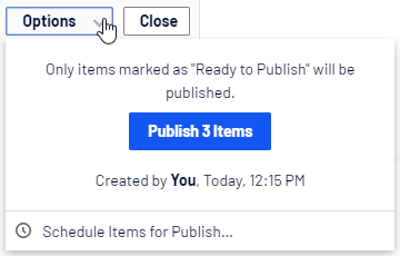 When items are ready for publishing, you can publish them directly from Options if you have publishing access rights or schedule the project to be published later.