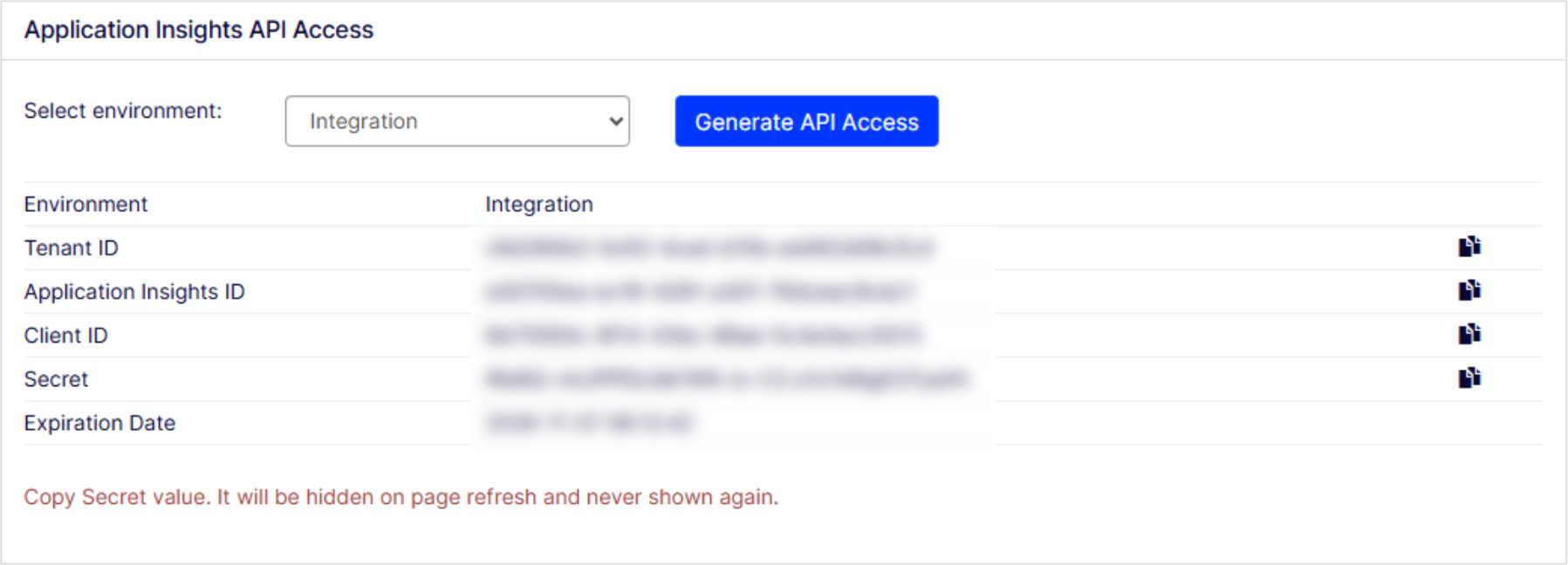 Select an environment and click Generate API Access in the Application Insights API Access section. This action generates and displays the information needed to access Application Insights. Credentials last for 1 year after being generated and will need to be re-generated after that point.
