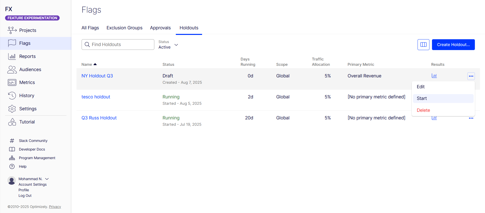 After creating the holdout, it displays in the Holdouts tab, where you can start it.