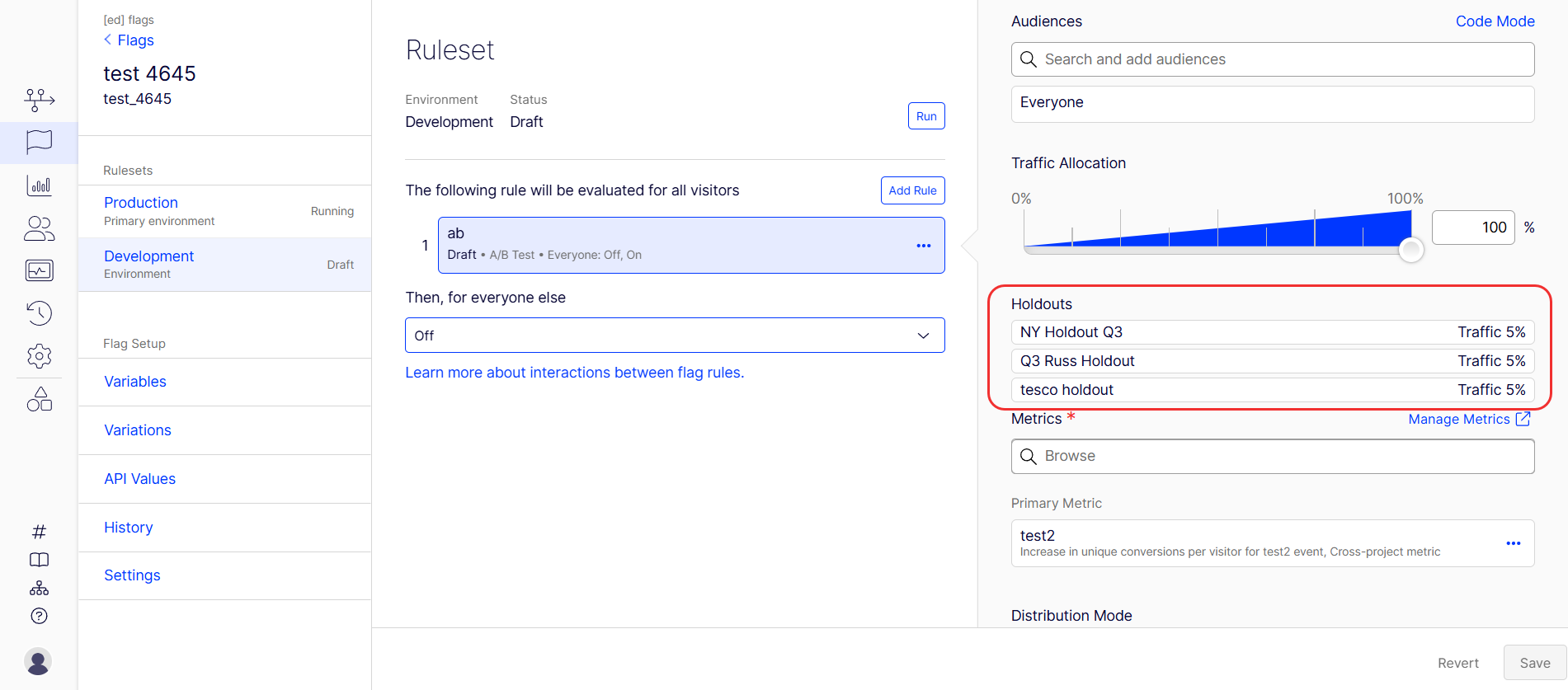 To see holdouts that Feature Experimentation applied to a rule, go to Flags > Environment > Rule. The holdouts applied, along with the traffic allocated, display.