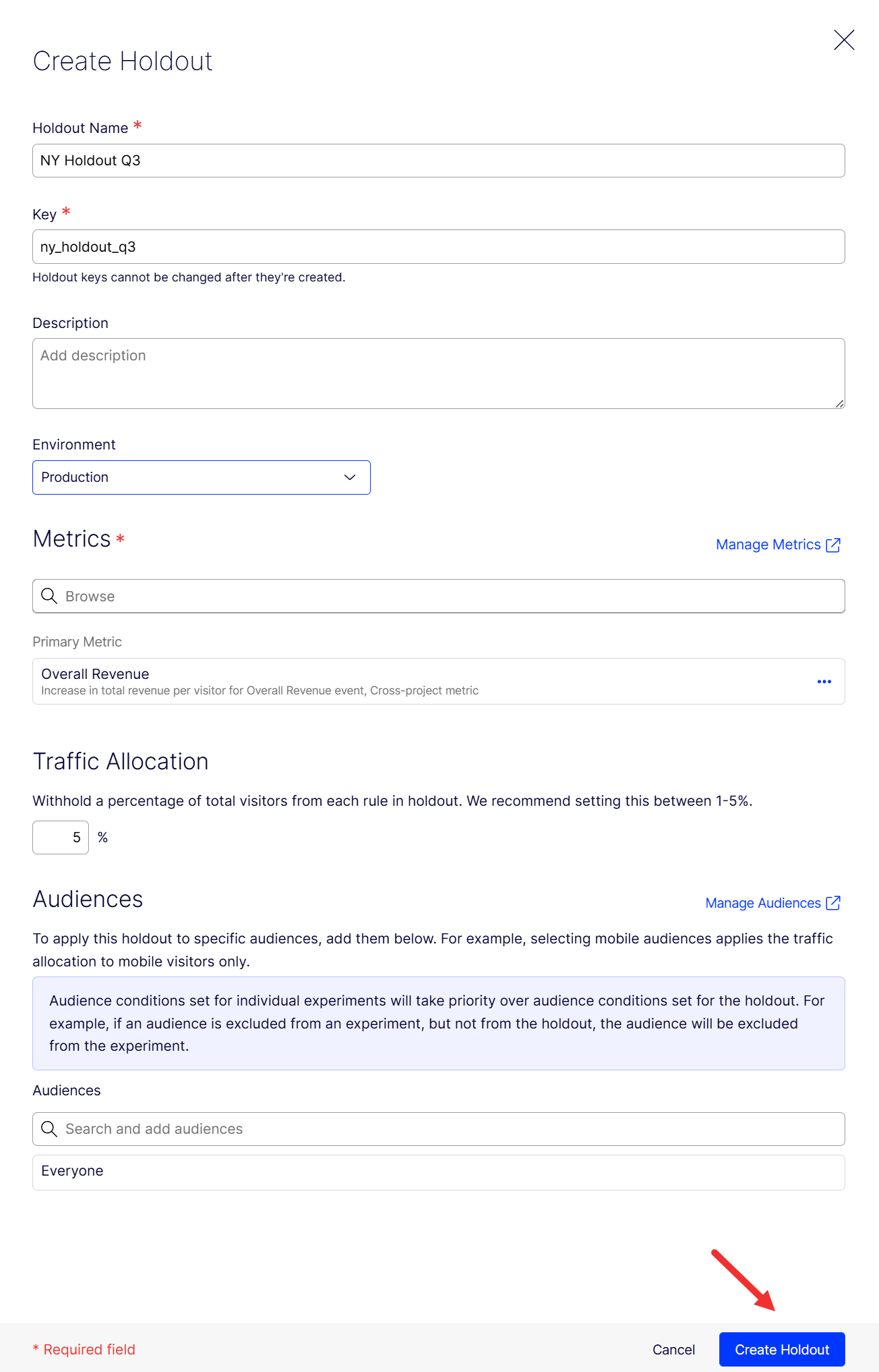 Edit the Holdout Key and optionally add a Description. Valid keys contain alphanumeric characters, hyphens, and underscores, are limited to 64 characters, and cannot contain spaces. You cannot modify the key after you create the holdout.