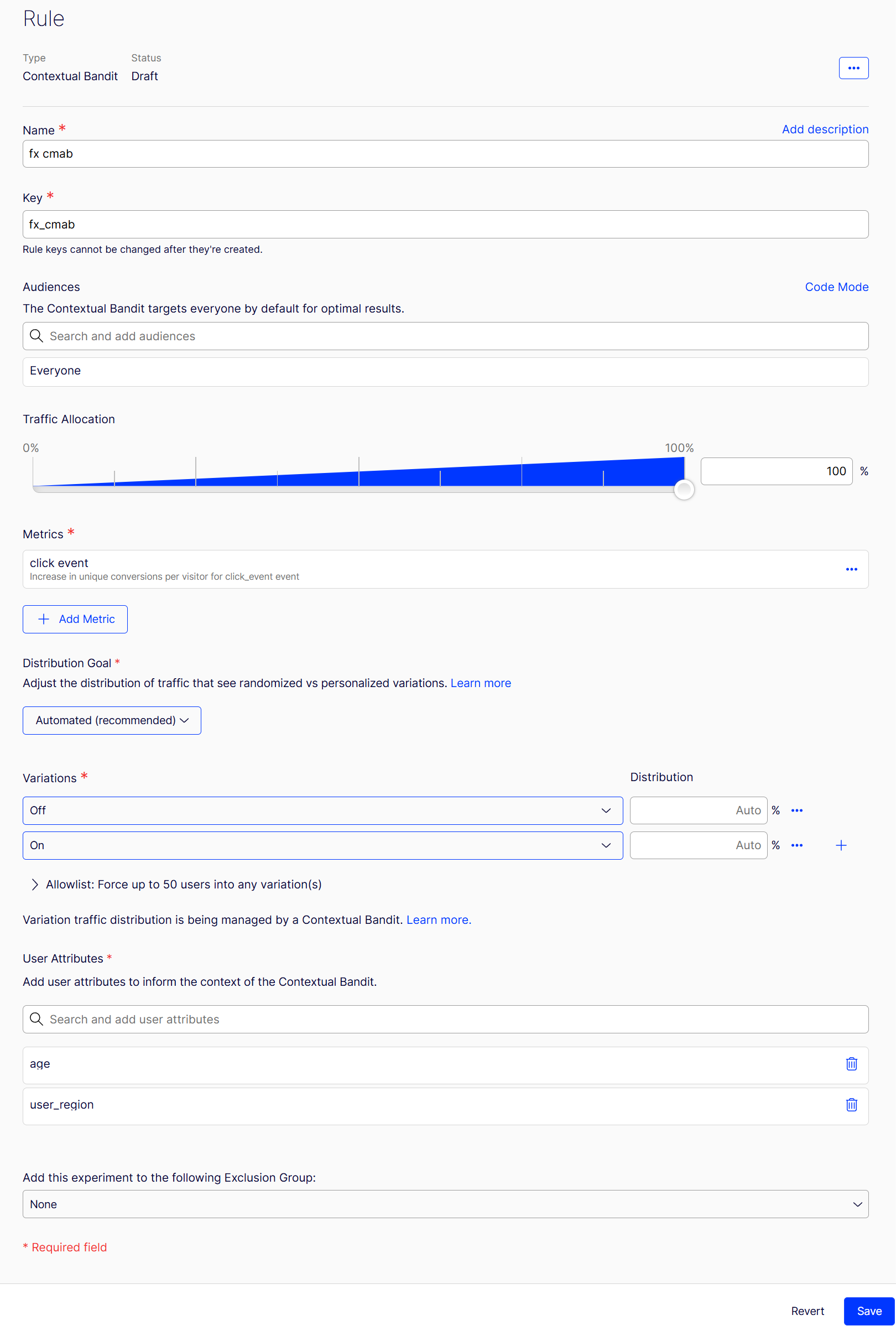 - Define User Attributes. These are the characteristics you provide to CMAB for personalization.