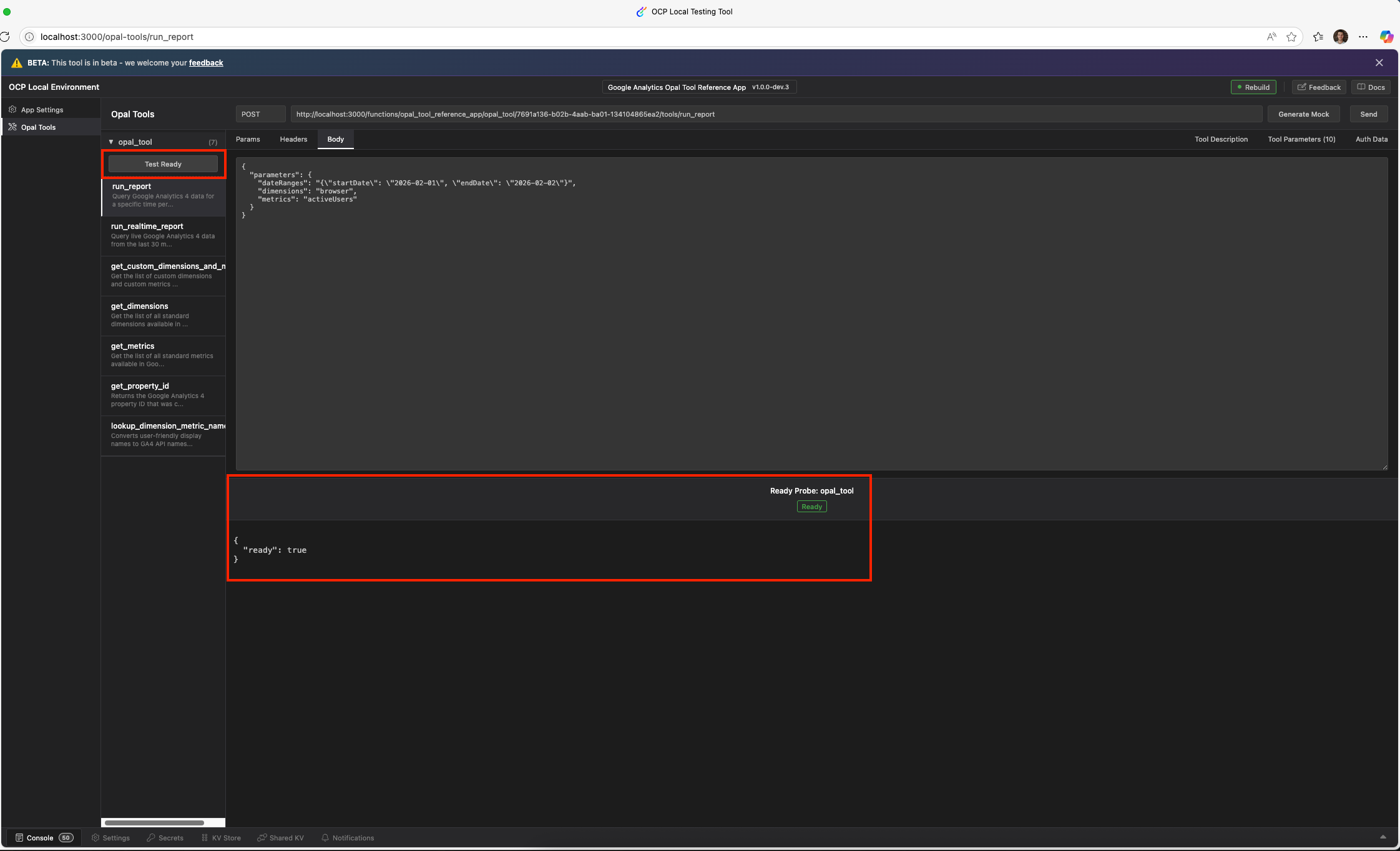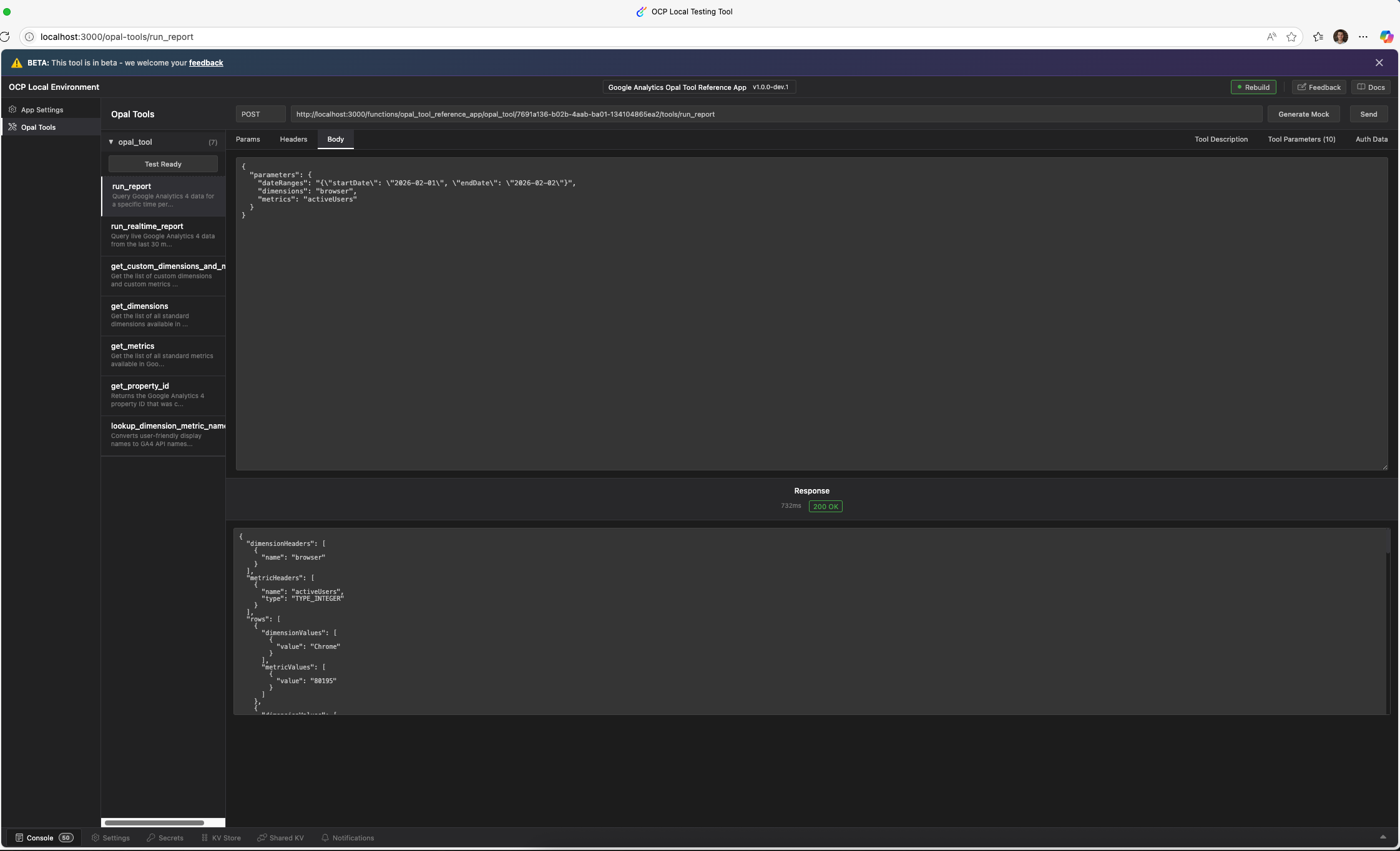 ocp devThis command starts a local development server that simulates the OCP environment. Select Opal Tools to test your tools. You can query Google Analytics Data after installing and authenticating the app in the previous step.