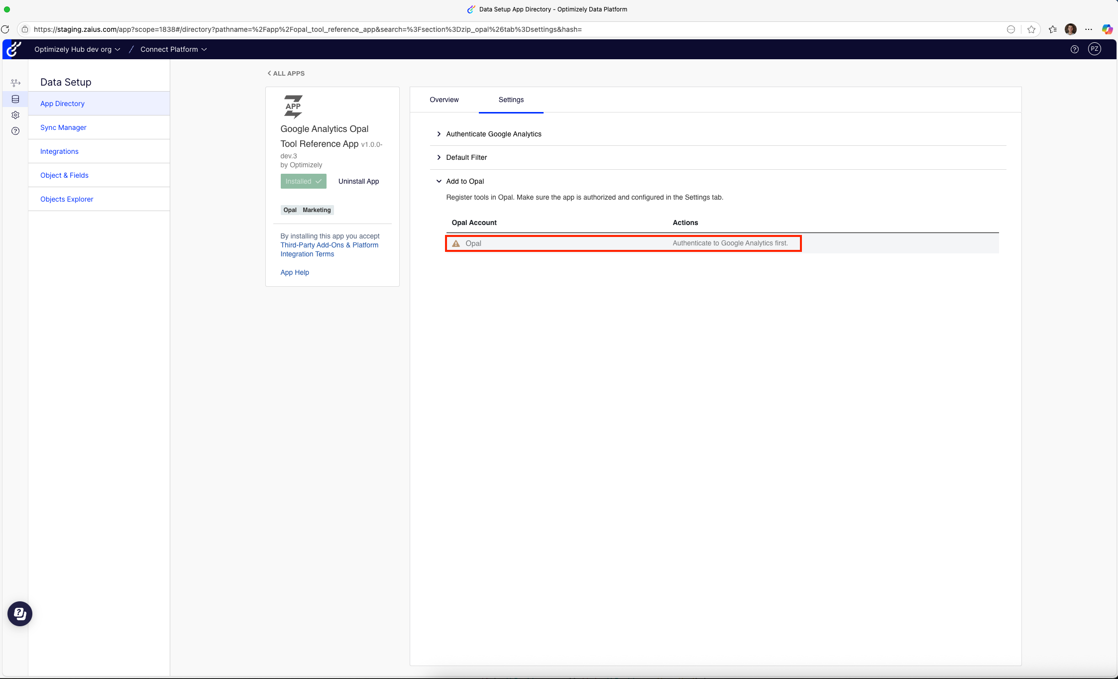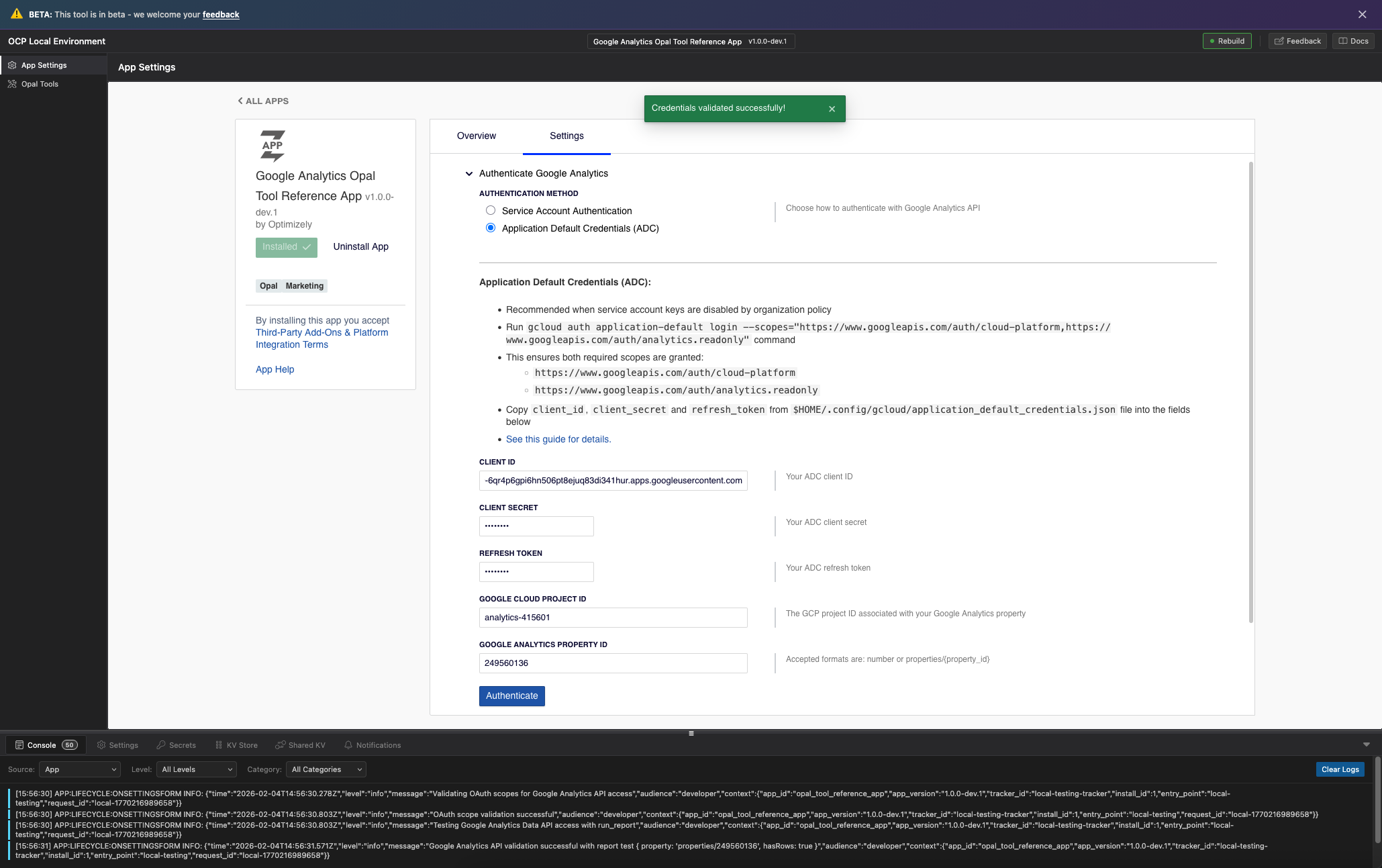 NoteThe Google Analytics 4 Opal tools app implements per-organization authentication. The OCP admin configures and authenticates the app in OCP, and all users within that organization share the same credentials when accessing Google Analytics data through Opal.