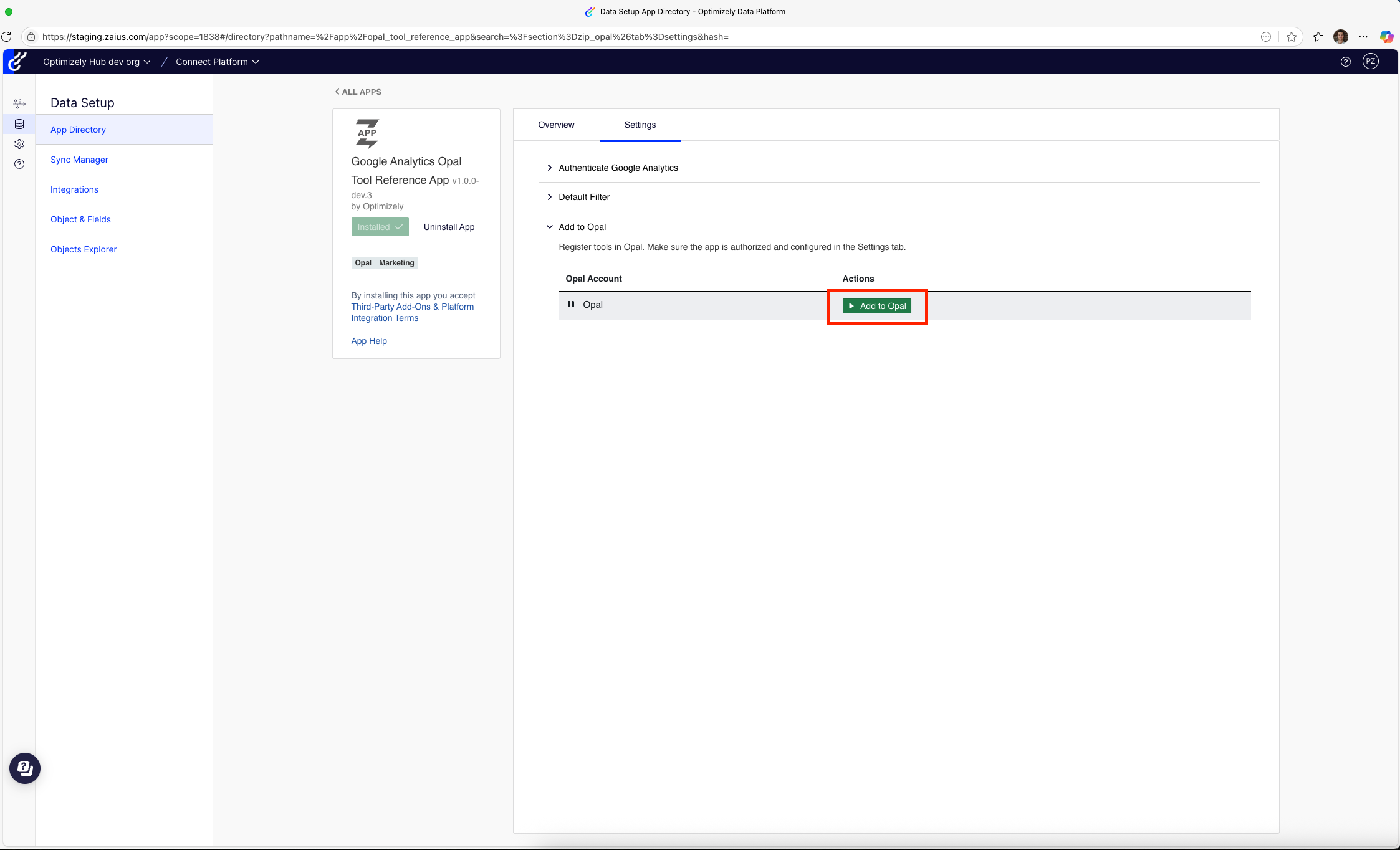This guide helps you build an Optimizely Connect Platform (OCP) app that implements Optimizely Opal tools. Optimizely based this implementation on the Optimizely-developed and publicly available Google Analytics 4 Opal tool. Access the tool in the OCP App Directory or directly through Opal.