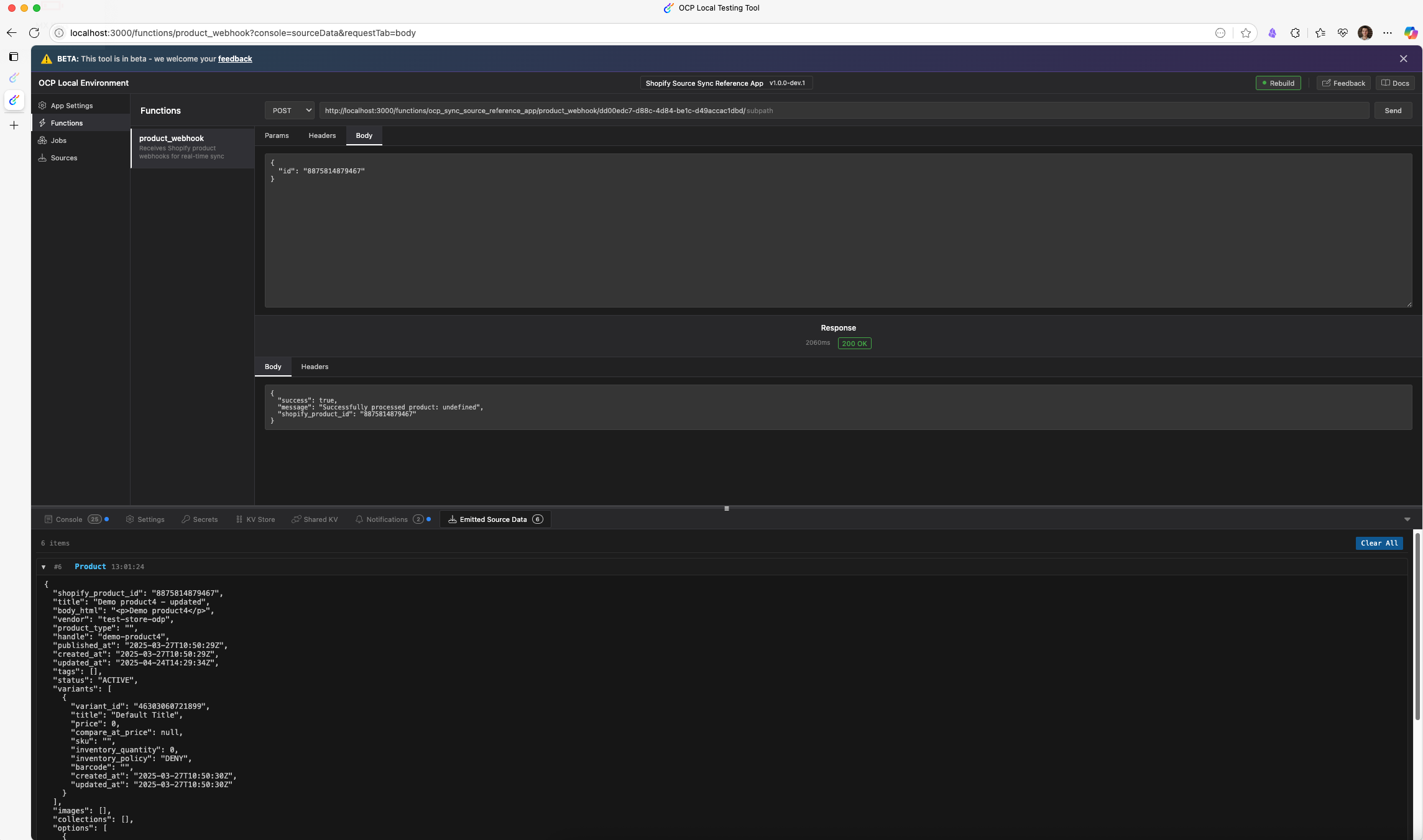 sources.emit(). The job tracks its cursor position in state so it can resume if interrupted. - Webhook function – A function that receives Shopify product webhooks (