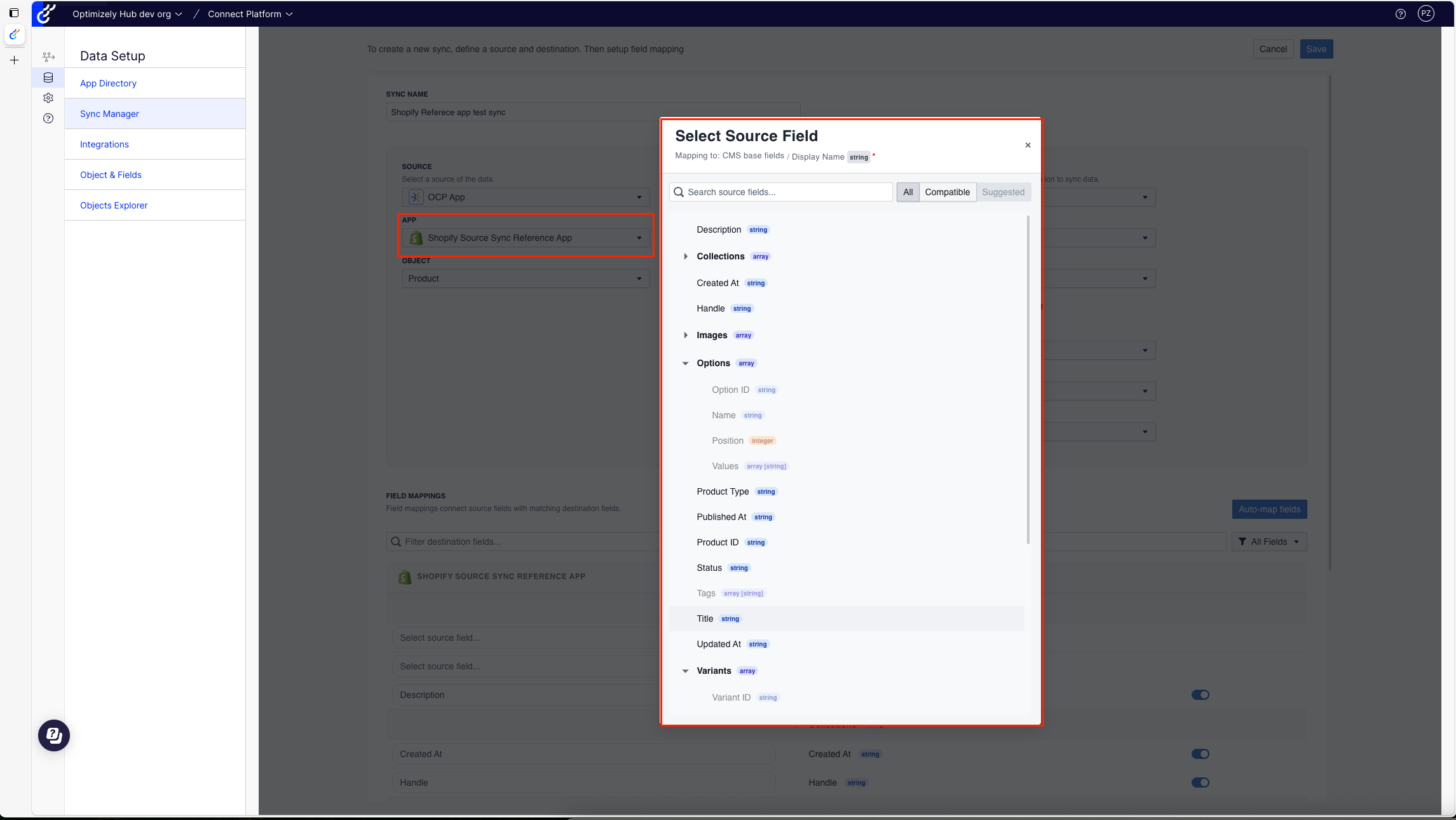 isDeletedflag. When you update a collection in Shopify, the app re-fetches all products in that collection and re-emits them so collection membership changes propagate. - Go to Data Setup > Sync Manager and click New Sync to sync Shopify data to other Optimizely products. View the available fields for mapping under Field Mappings for your selected Shopify product source.