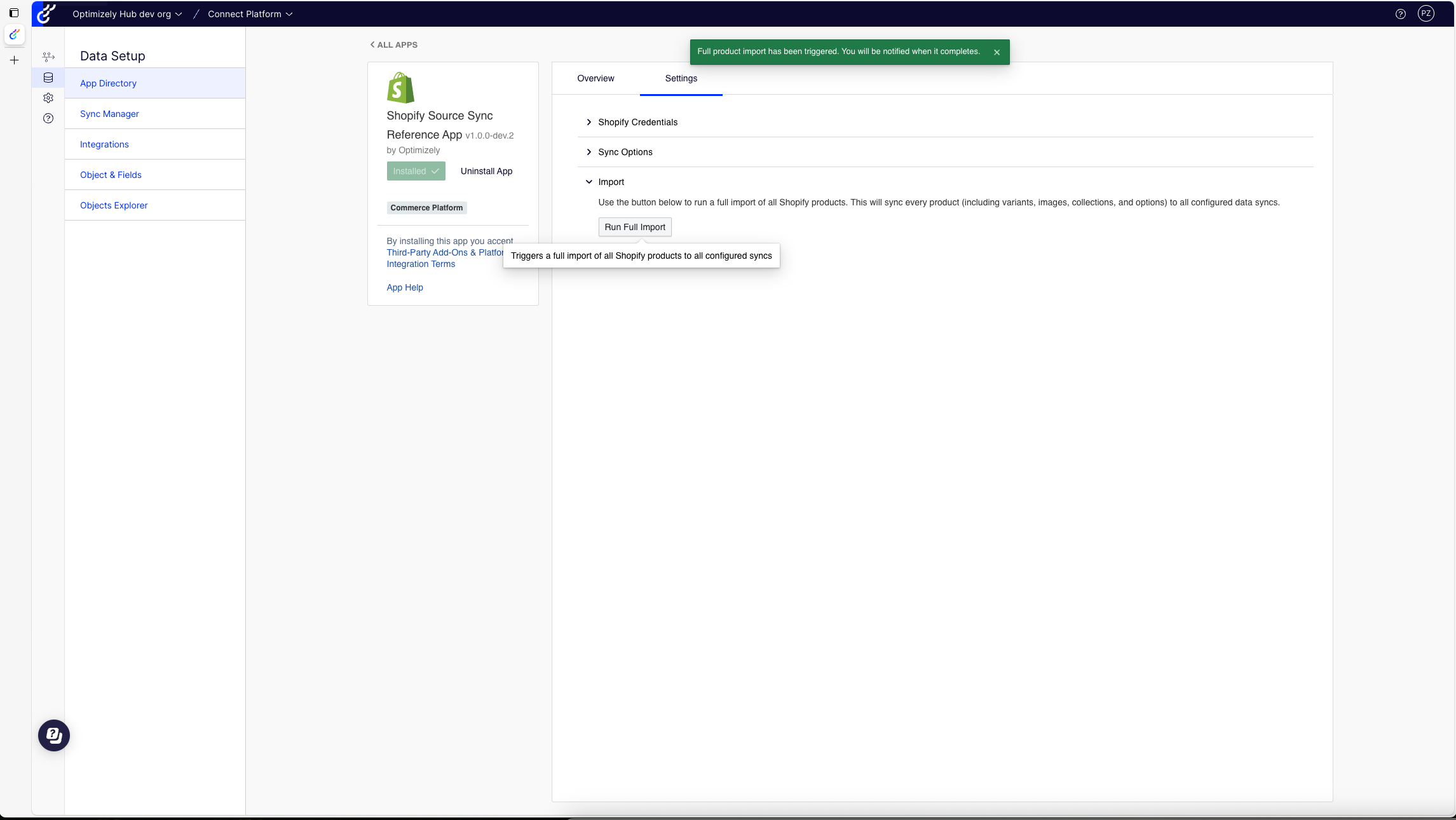 Click Run Full Import to trigger a historical import. The app imports products in batches of 50 and sends a notification when complete.