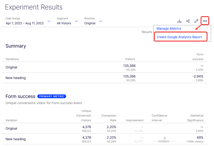 Use Report Generation to send experiment variations to GA4 as audiences, eliminating the need to manually create custom dimensions and segments. This lets you compare and contrast the performance of variations through custom reports on audiences. See Configure Report Generation for information.