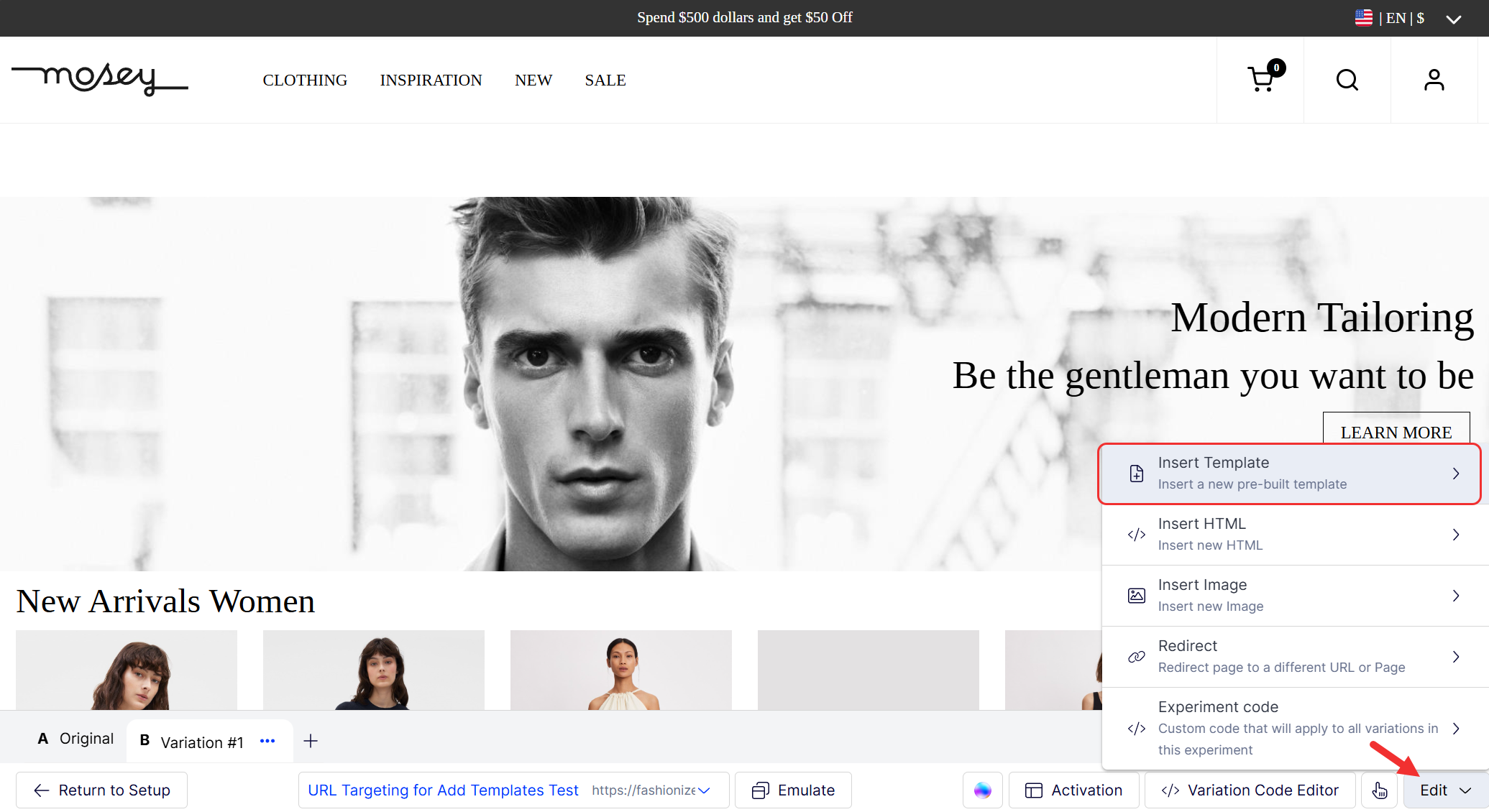 Click Edit and select Insert template within the Visual Editor overlay.